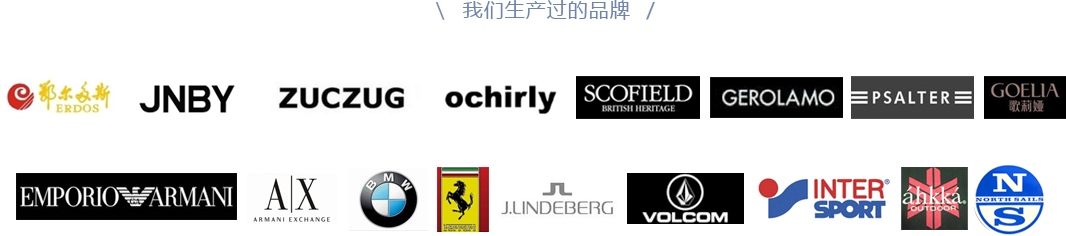 新元服裝擁有一支有著豐富經(jīng)驗(yàn)和忠于職守的專業(yè)團(tuán)隊(duì),以誠(chéng)信為本,嚴(yán)謹(jǐn)務(wù)實(shí),重視質(zhì)量和交期,與國(guó)內(nèi)外的多家客戶建立了長(zhǎng)期良好的合作關(guān)系,公司的服務(wù)的國(guó)內(nèi)外品牌包括: